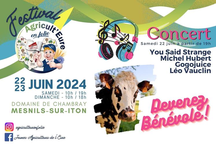 La seconde édition du festival Agricult'Eure en Folie aura lieu les 22 et 23 juin 2024 au lycée Edouard de Chambray à Mesnils-sur-Iton. Pour préparer les festivités, les futurs bénévoles se sont réunis le vendredi 24 mai à Guichainville pour assister à une réunion d'information.
