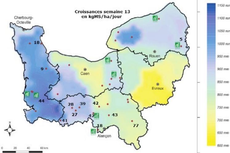 La pousse de l'herbe est dans les normes de ce qui a été mesuré ces dernières années avec une moyenne normande de 33 kg MS/ha/j.
