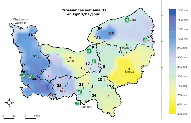 La croissance de l'herbe s'est élevée à 31 kg MS/ha/j la semaine passée en Normandie.