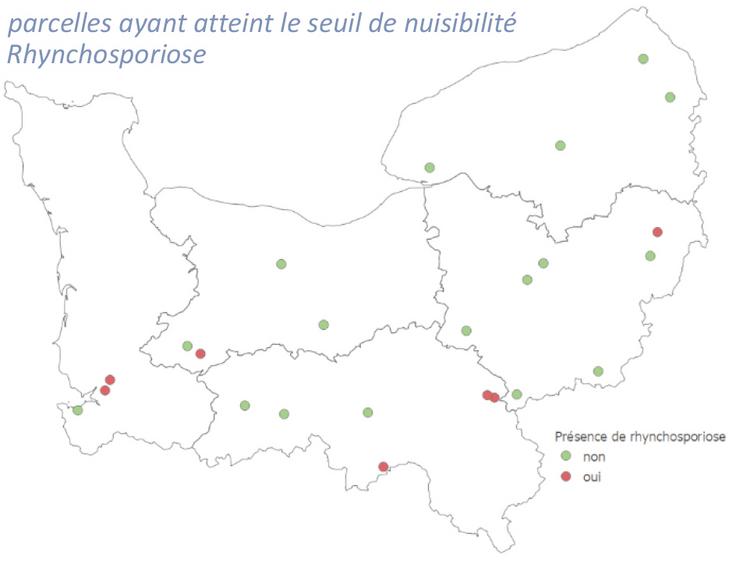 Au vu de l'intensité des symptômes : 5 parcelles ont dépassé le seuil de nuisibilité. Il s'agit de parcelles situées dans la Manche, le Calvados et l'Orne, semées avec les variétés Lg Audace, Sy Adoration, Chevignon, et 2 mélanges.