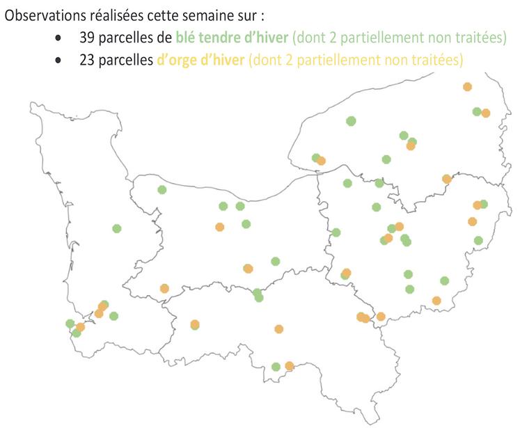 Rouille Jaune : sur les 39 parcelles observées en blé tendre au niveau de la rouille jaune, 3 parcelles présentent des symptômes avec 10 à 80 % des F3 atteintes. Ces trois parcelles présentent également des pustules sur F2 (10 à 50 % des F2 touchées). Il s'agit des variétés Karoque, Lg Audace et d'un mélange. Ces parcelles sont situées dans l'Eure, l'Orne et le Calvados. Le seuil de nuisibilité est atteint pour ces trois parcelles.