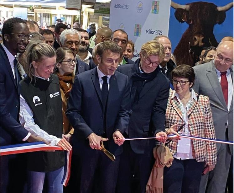 Arrivé à 9 h 30, il a coupé le traditionnel cordon tricolore aux côtés du ministre de l’Agriculture, Marc Fesneau, du président du Ceneca, Jean-Luc Poulain et de Christiane Lambert avant d’entamer son parcours à travers les allées du Salon déjà bien remplies. Il a commencé par saluer l’égérie de ce grand rendez-vous annuel de l’agriculture et des traditions culinaires : Ovalie, la vache de race Salers accompagnée de ses deux jumelles Utopie et Utopia. Les propriétaires d’Ovalie, Marine et Michel Van Simmertier l’ont notamment interpelé sur la sécheresse, les rats taupiers ainsi que sur le Mercosur. « Moi, j’ai tenu une position de fermeté sur le Mercosur et je vais continuer à la tenir (…) je veux qu’ils (les pays du Mercosur, ndlr), respectent autant que nous l’environnement et qu’il y ait des clauses miroirs », a répondu le chef de l’État. Il a également appelé les distributeurs à « faire un effort sur leurs marges » face à l’inflation. Les prix de l’alimentation sont en hausse de 12 % sur un an, en raison notamment de la guerre en Ukraine et de la reprise économique post-Covid. Emmanuel Macron s’est ému que 70 % de la viande servie dans la restauration hors domicile, soit étrangère : « elle n’est pas française. Ça, ce n’est pas le Mercosur. Il faut que la filière s’organise mieux. On sert de la viande européenne. Il n’y a rien qui l’impose », a-t-il ajouté.