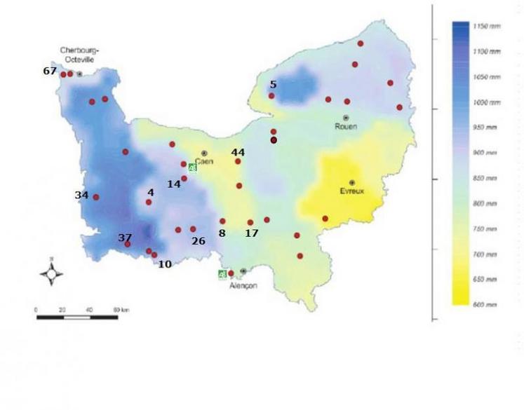 La carte parle d'elle-même , en l'absence d'herbe de nombreux sites n'ont pas fait l'objet de mesures. C'est le cas notamment de l'est de l'Orne et de l'ex haute Normandie. Hormis chez les éleveurs de vaches allaitantes la distribution de fourrage à l'auge reste élevée et représente plus de 75 % des besoins dans de nombreux cas.