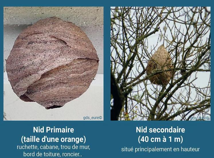 Le nid primaire n’est habité que par la reine. A la fin duprintemps, il sera abandonné à la faveur d’un nid secondaire situé dans les arbres en hauteur pouvant abriter plusieurs milliers d’individus. La destruction des nids primaires est primordiale afin d’éviter l’apparition de nids secondaires plus dangereux et plus coûteux à détruire.