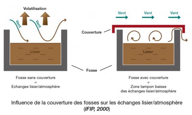 Il existe plusieurs postes responsables d’émissions d’ammoniac en élevage et cela concerne notamment toute la chaîne de gestion des effluents. Concernant le stockage d’effluent, le principal risque est la volatilisation de l’ammoniac qu’il contient, ce risque étant plus élevé avec le stockage de lisier. En 2014, en Normandie, 28 % des émissions d’ammoniac de l’élevage bovin étaient imputables au stockage des effluents, 21 % pour les volailles et 22 % pour les porcins (source : Atmo Normandie). Le constat est simple, plus l’effluent reste au contact de l’air libre plus les émissions sont importantes. Le principe de la couverture des fosses de stockage est de limiter le contact entre l’effluent et l’atmosphère et ainsi réduire les échanges gazeux. Il est difficile de déterminer un taux d’abattement des émissions d’ammoniac grâce à la couverture de fosses car de nombreux autres facteurs interviennent. Néanmoins, selon les études, cet abattement est évalué par l’Ademe entre 40 et 90 % des émissions selon les types de couverture. Plusieurs facteurs tels que la composition des déjections, la surface de contact entre le lisier et l’air, la durée de stockage ou encore les conditions météorologique influent sur les émissions d’ammoniac.