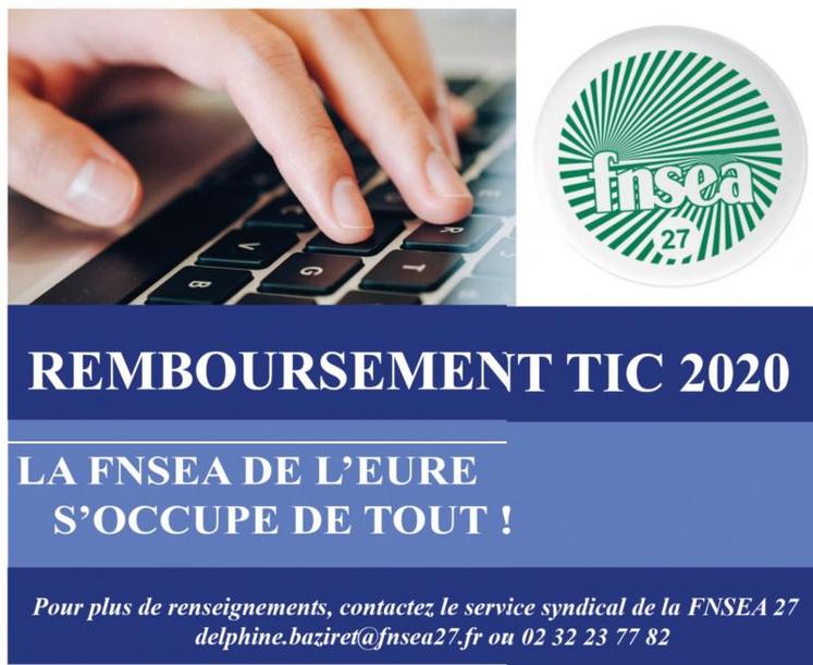 La FNSEA 27 vous accompagne, dans votre demande de remboursement de la TIC, sur internet via le portail Chorus-pro. Si vous êtes intéressés, nous vous invitons à prendre contact dès maintenant avec le service syndical FNSEA 27, par téléphone au 02 32 23 77 82 ou par mail à l'adresse delphine.baziret@fnsea27.fr