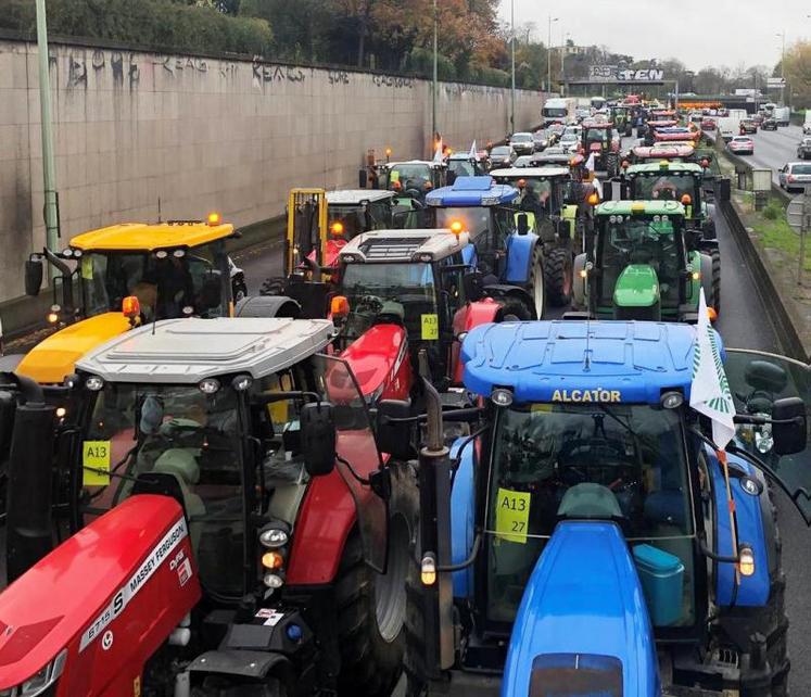 Mercredi 27 novembre, FNSEA et Jeunes agriculteurs du grand bassin parisien ont organisé une manifestation à Paris où plus de 1 000 tracteurs ont convergé jusqu'au périphérique.